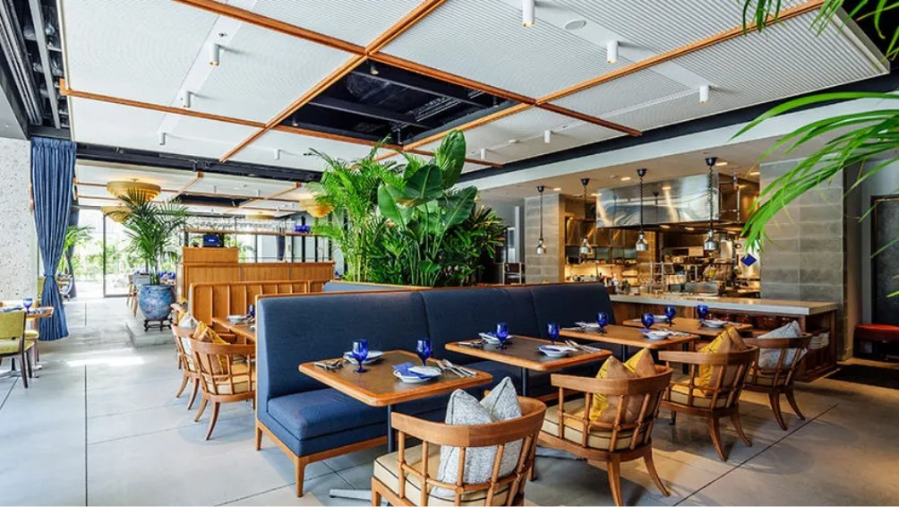 沖縄の気候を肌で感じられる屋外のテラス席と、バーカウンター、オープンキッチンが広がる賑やかな屋内席。